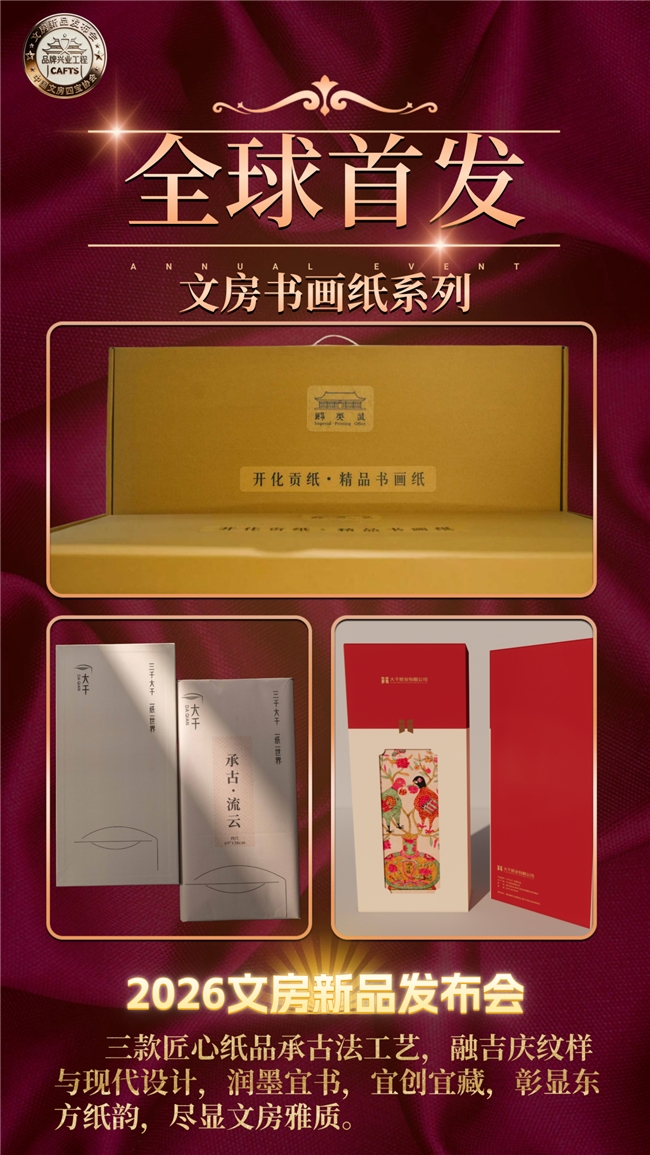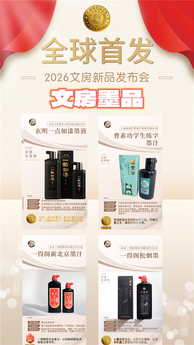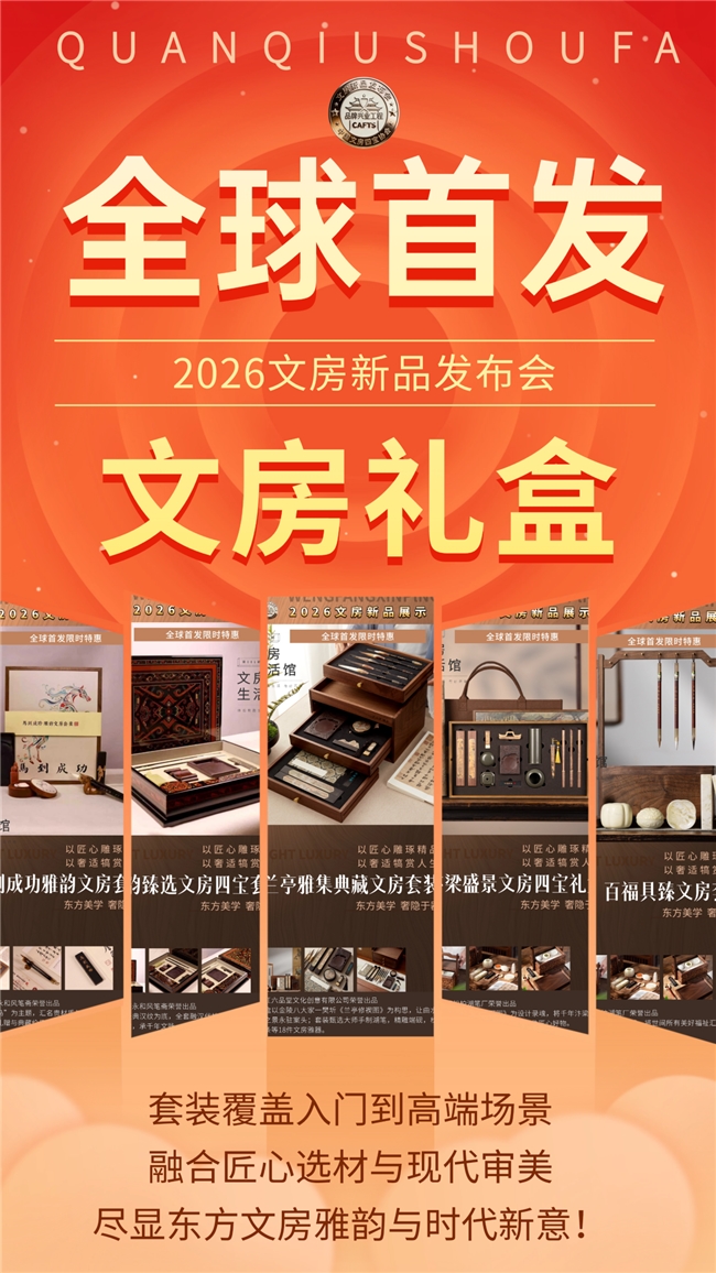 近日,由中国文房四宝协会与北京京东世纪贸易有限公司联合主办、协会市场研究与督导专委会、浙江六品堂文化创意有限公司、浙江湖颖文化有限责任公司、西安问心堂文化创意有限公司、孚棋(北京)文化艺术传播有限公司协办,“六品堂”独家冠名的“2026文房新品发布会”在北京展览馆举行。作为第56届全国文房四宝艺术博览会核心活动,本次发布会集中发布覆盖文房礼盒、毛笔、墨品、书画纸、国画颜料、文房衍生品,全面展现文房四宝行业守正创新成果。